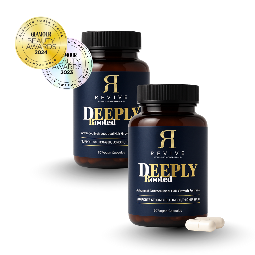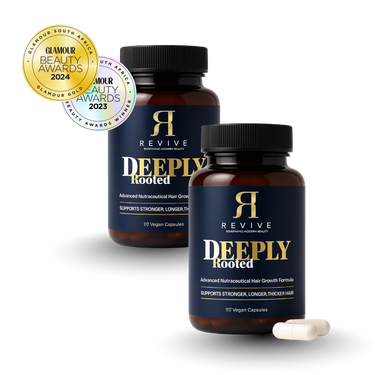 Our Award Winning Revive Deeply Rooted is a powerful vegan hair growth and nourishing supplement for both men and women. Scientifically formulated with clinically-proven ingredients to promote visibly stronger, longer thicker hair. Our potent blend of vitamins, minerals and herbs, plus a powerful super-antioxidant complex, synergistically promotes hair growth, increased follicle strength and combats the daily disruptive factors which can affect your hair growth cycle. Taking our vitamins daily ensures you with beautiful, healthy hair you desire.